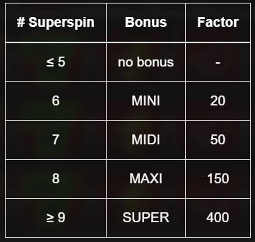 Superspin je bonus závisející na počtu dotáčení displejů. Obsahuje 4 kategorie – mini, midi, maxi a super. Hráč obdrží výhru ve výši celkové sázky násobené výherním faktorem.