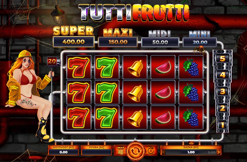 Online hrací automat Tutti Frutti vyrobilo studio Kajot. Má 5 válců a 20 výherních linií. Má klasické ovocné symboly. Samozřejmostí je symbol Wild, který nahrazuje ostatní symboly a napomáhá vytvořit výherní kombinace.